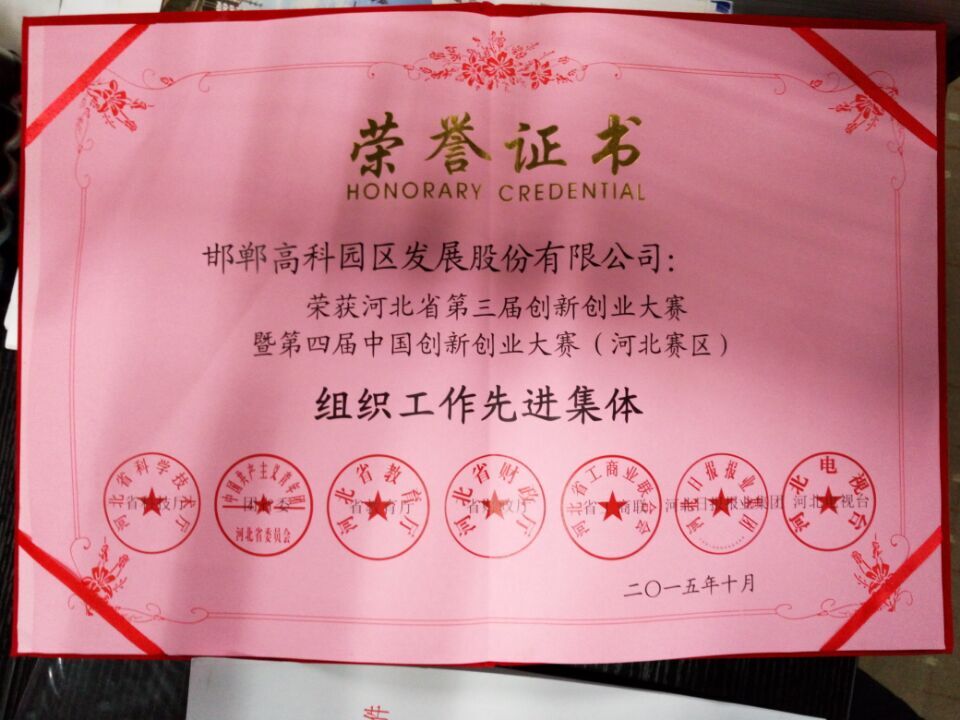 在本年度舉辦的河北省第三屆創(chuàng)新創(chuàng)業(yè)大賽暨第四屆中國創(chuàng)新創(chuàng)業(yè)大賽(河北賽區(qū))決賽中,邯鄲高科園憑出色組織工作,榮獲大賽的“組織工作先進集體”獎。