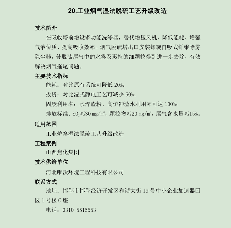 指導目錄中,唯沃入選的技術是“工業煙氣濕法脫硫工藝升級改造”,主要適用于工業爐窖濕法脫硫工藝升級改造,比原有系統降低20%的能耗,并且水淬渣粉、高爐沖渣水利用率可達100%,是科技治霾、精確治污的重要標志性技術之一。